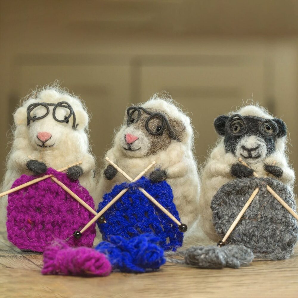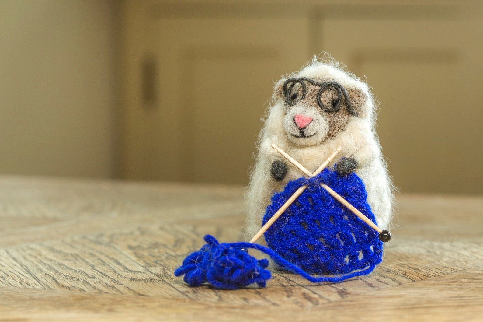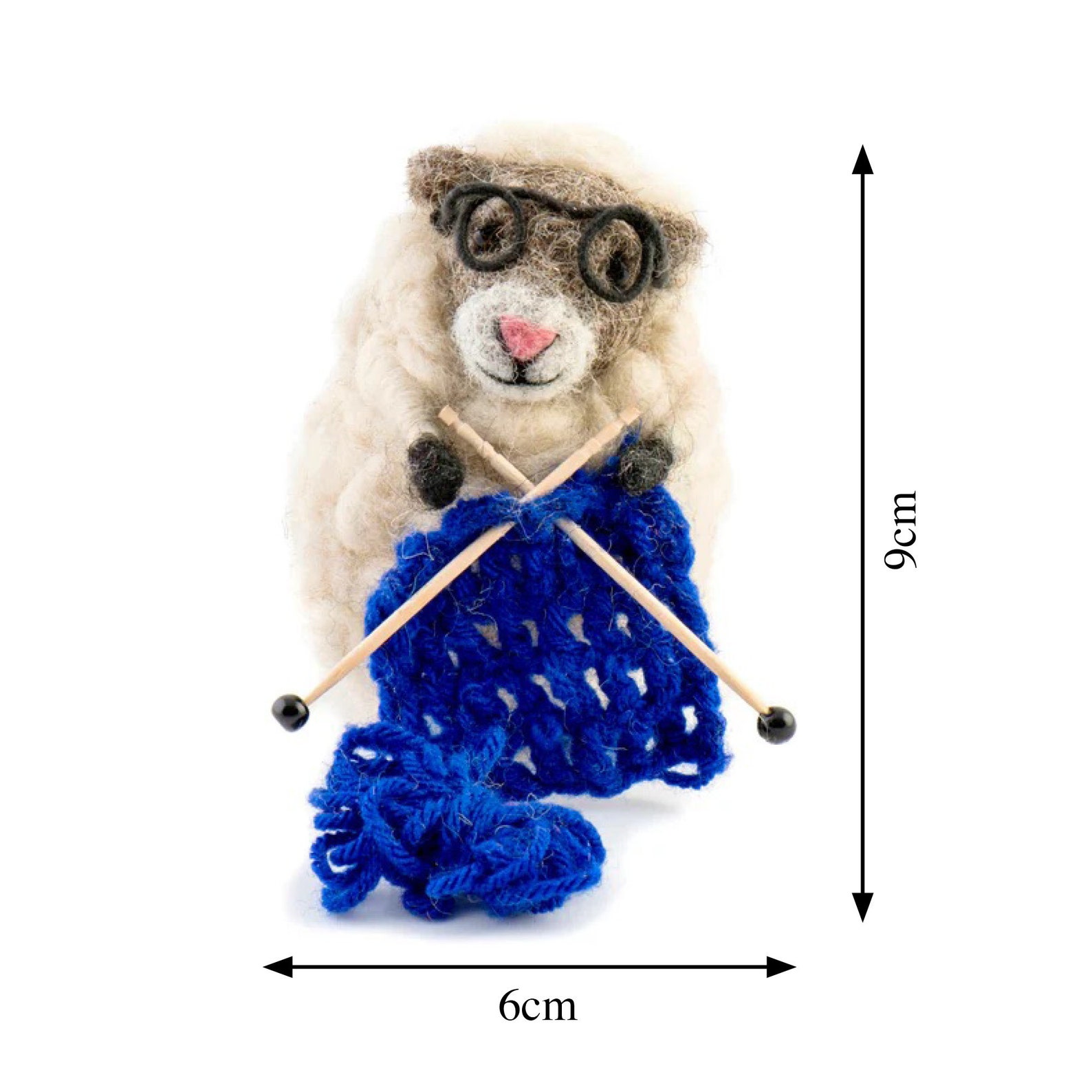 Super sweet Knitting Nancy Sheep is a hand needle felted woolly sheep with spectacles, tiny wooden knitting needles and stylish blue knitting.