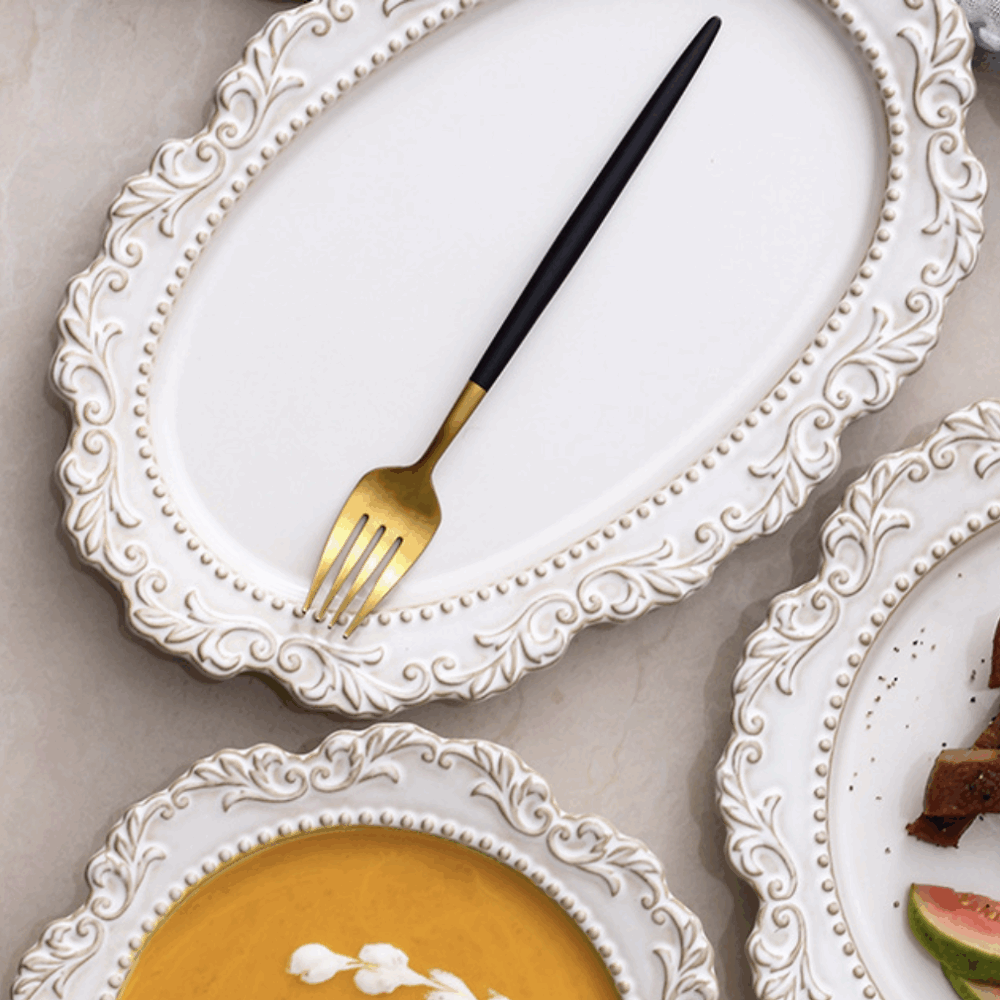 Vintage Baroque Embossed Palace Style Ceramic Oval Dinner Plate Tableware